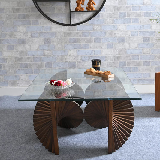 Stripique Wooden Modern Geometric Base Glass Top Coffee table