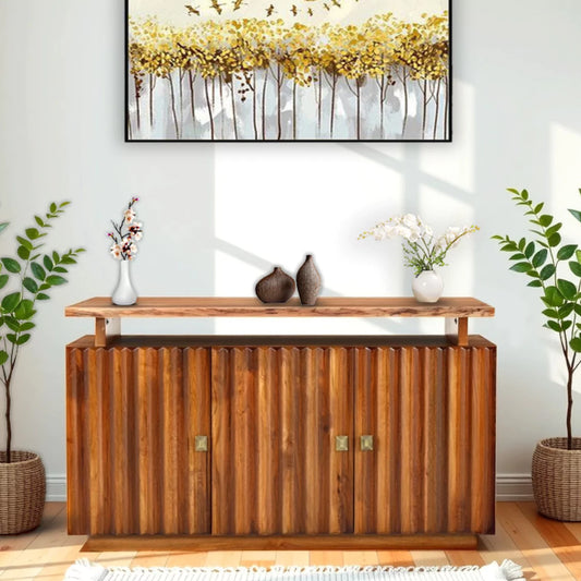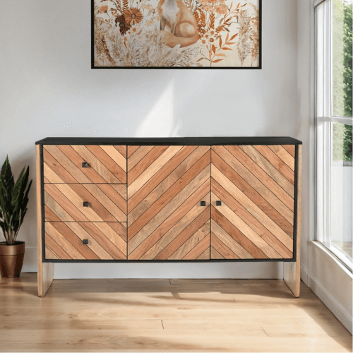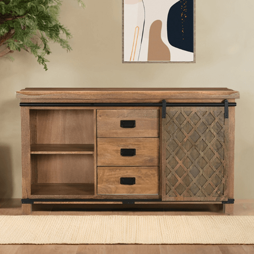Crafted from durable woods like teak or sheesham, traditional wooden sideboards offer a timeless charm shaped by 18th and 19th-century aesthetics. These pieces often feature intricate details such as carved borders, ornate brass or iron handles, and nature-inspired designs, making them a great choice for those who appreciate vintage-inspired furniture.